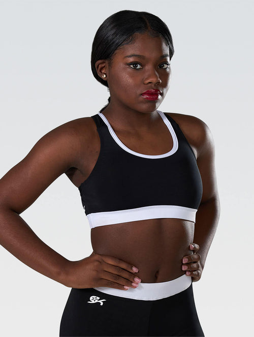 A pop of color and a fancy back will surely make you stand out from the crowd when you wear the GK All Star Colorblock Racer Crop Top that has it all. Classic black mesh combined with a sporty white colorblock trim make this a totally winning style from every angle. Look cool and keep dry with moisture-wicking Drytech fabric. You'll also find plenty of support with the racer-back design and nude shadow-proof front lining.Limited Availability, get it while it lasts!