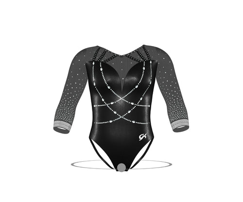 V-neck leotard with crisscross binding design on back available in three-quarter length or long sleeve options. Matching scrunchie included.